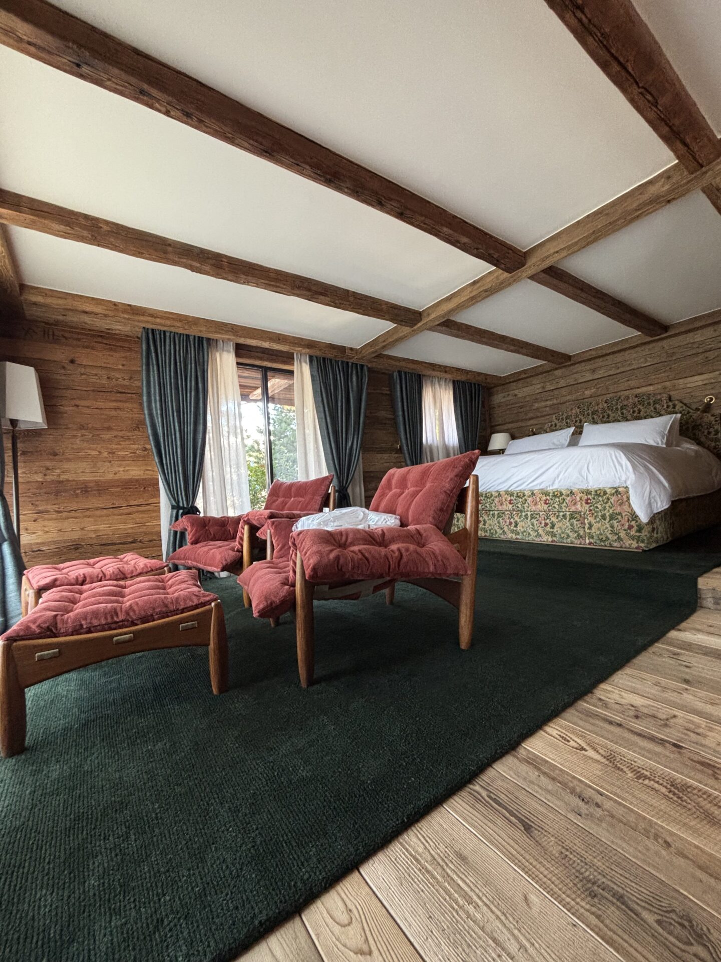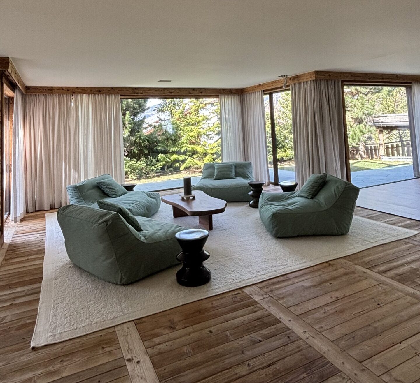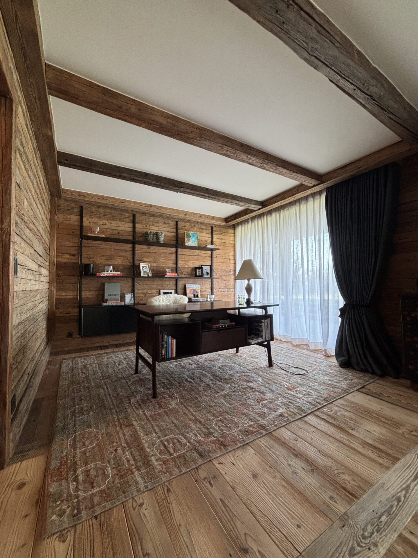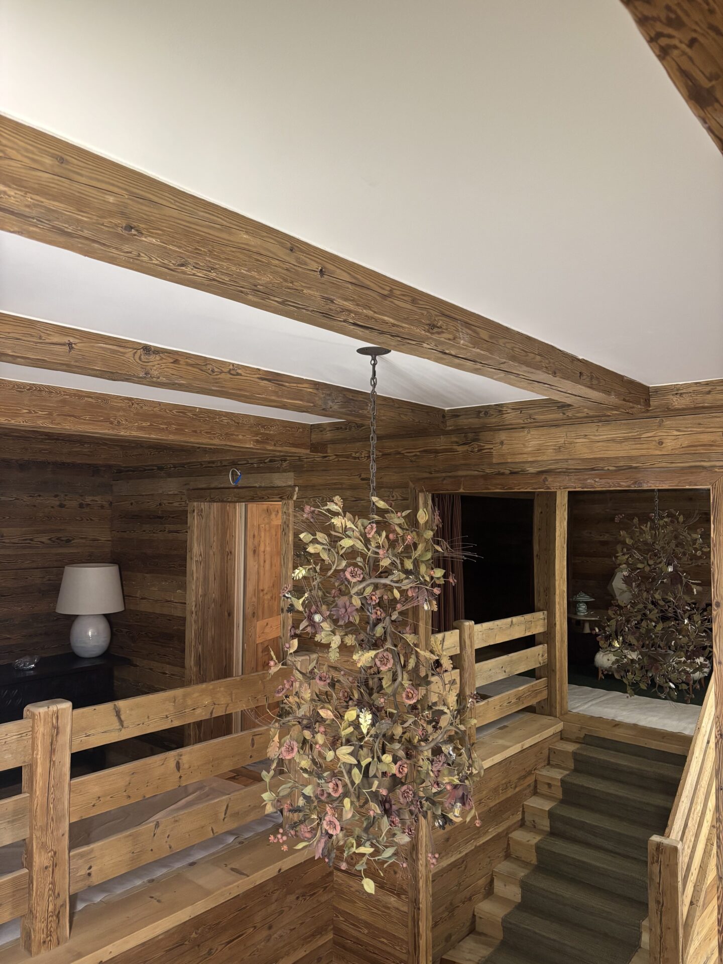 Pour ce chalet de luxe, nous avons réalisé les faux-plafonds ainsi que l’ensemble des travaux de peinture. Le chantier demandait une grande précision : seuls les plafonds entre poutres étaient à rénover. Nous avons donc méticuleusement protégé toutes les boiseries existantes, y compris les poutres apparentes, afin de préserver leur caractère authentique.