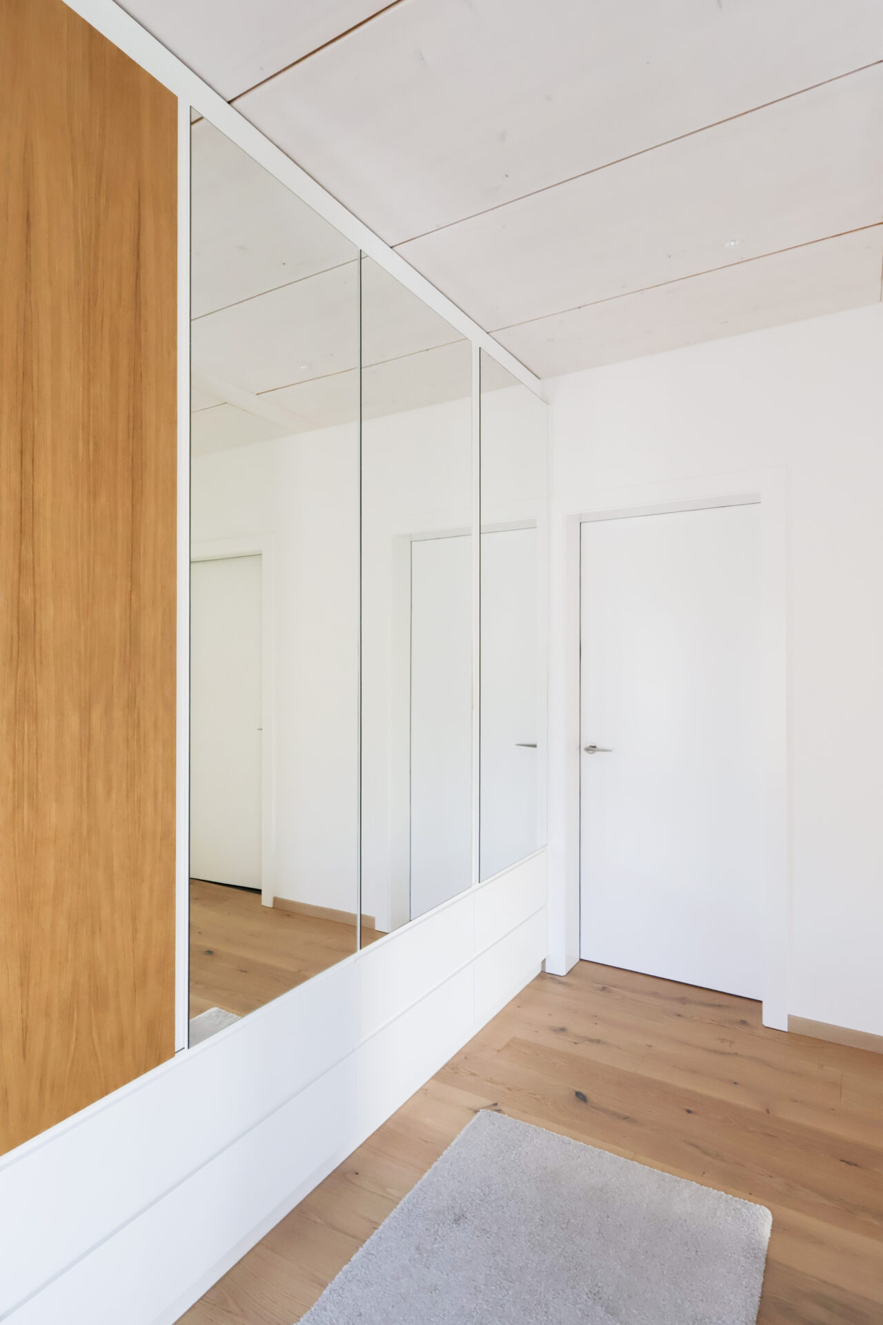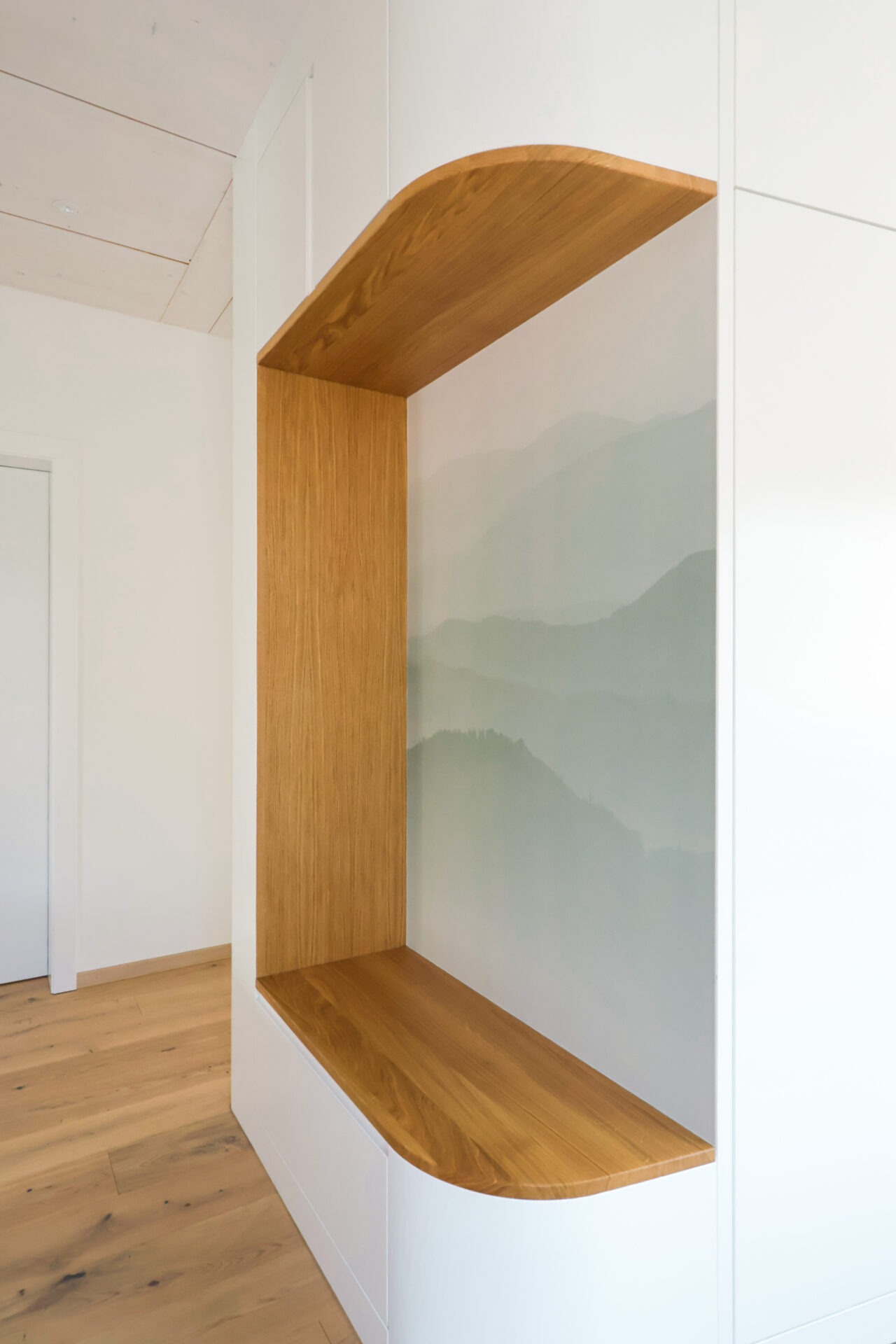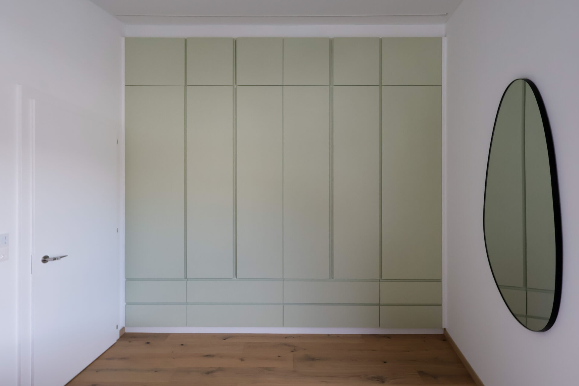 Les boiseries ont été réalisées en émail blanc, avec une armoire en vert pastel à l’étage. Les plafonds ont été finalisés avec des toiles tendues pour une finition moderne et soignée.