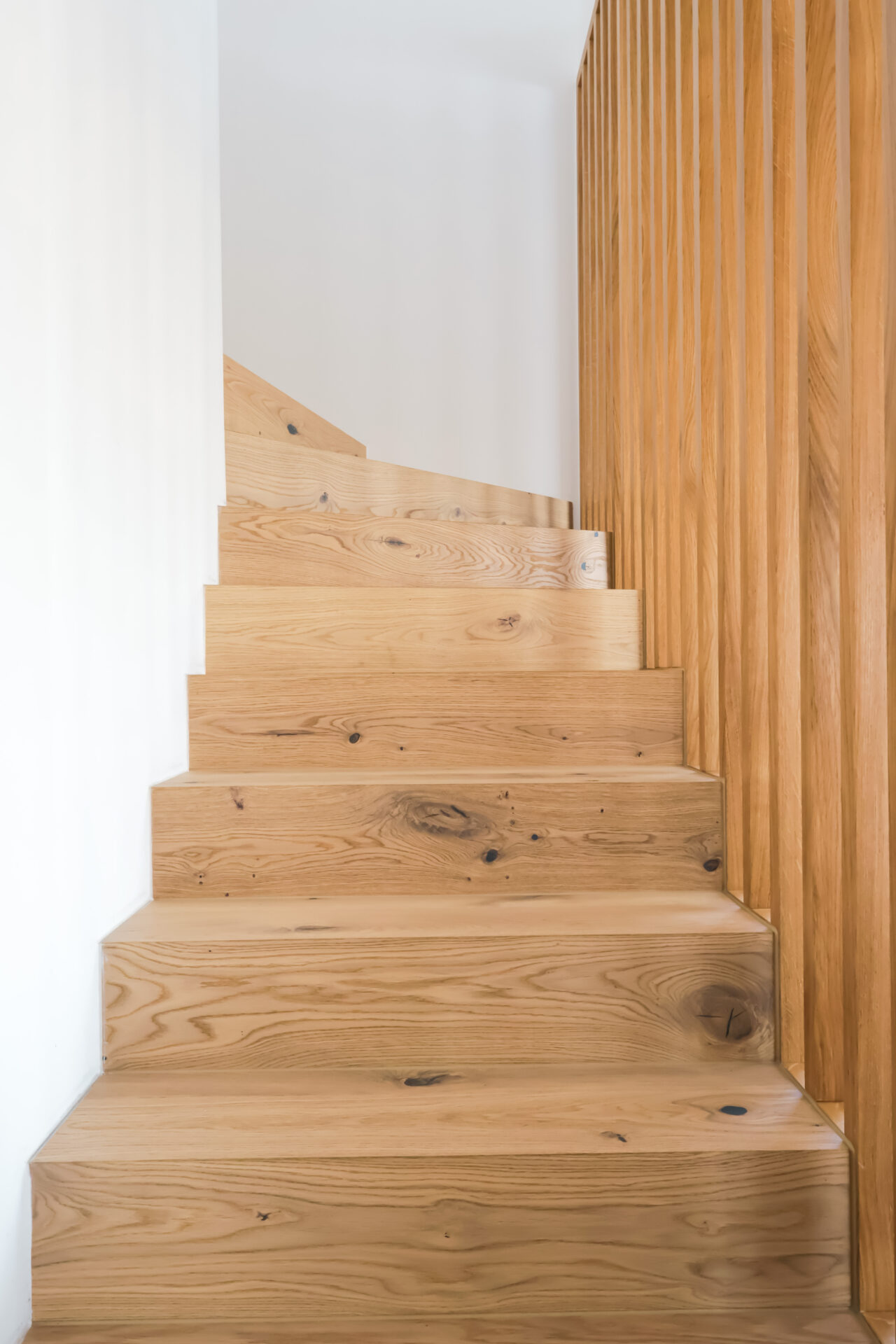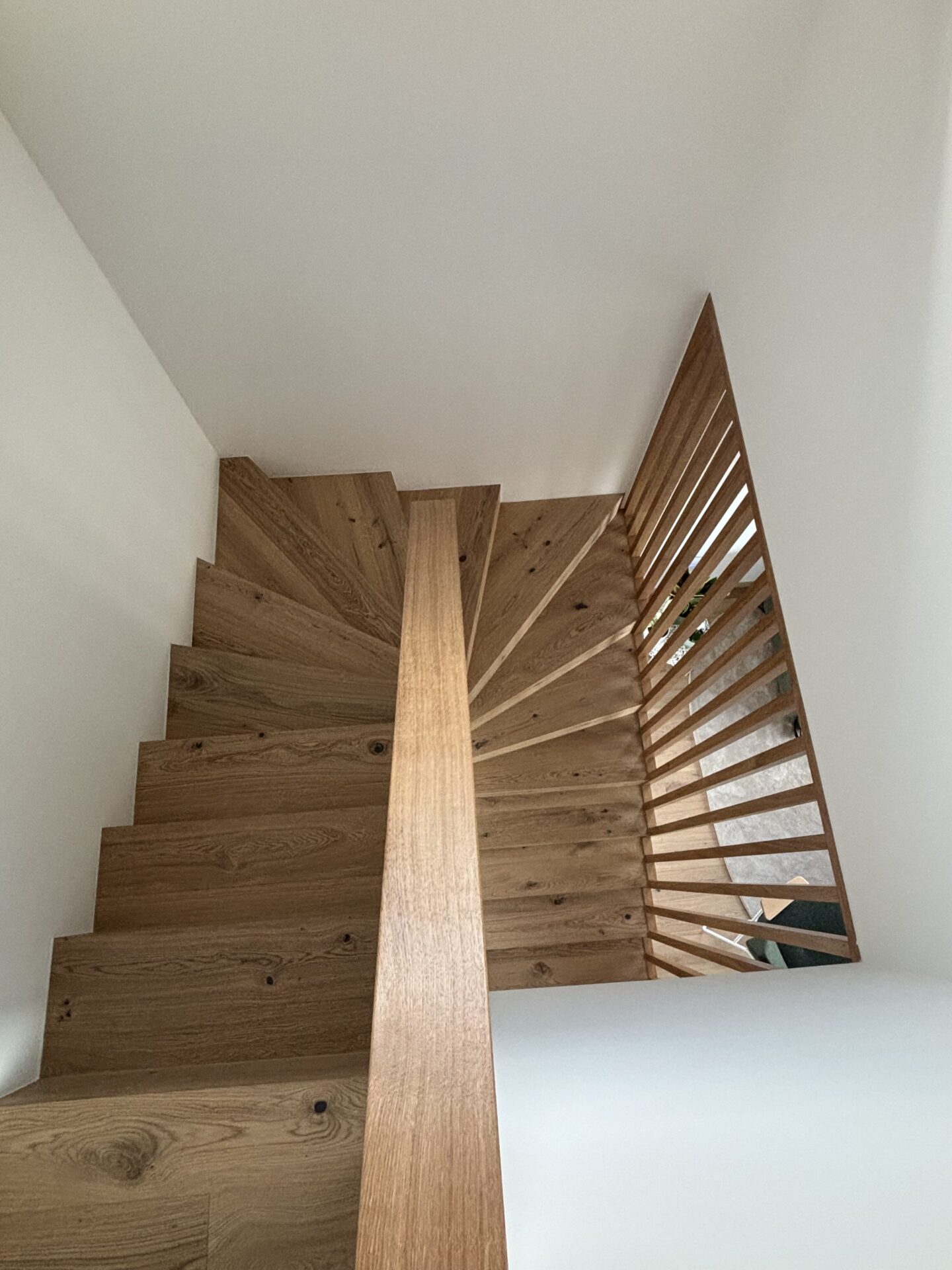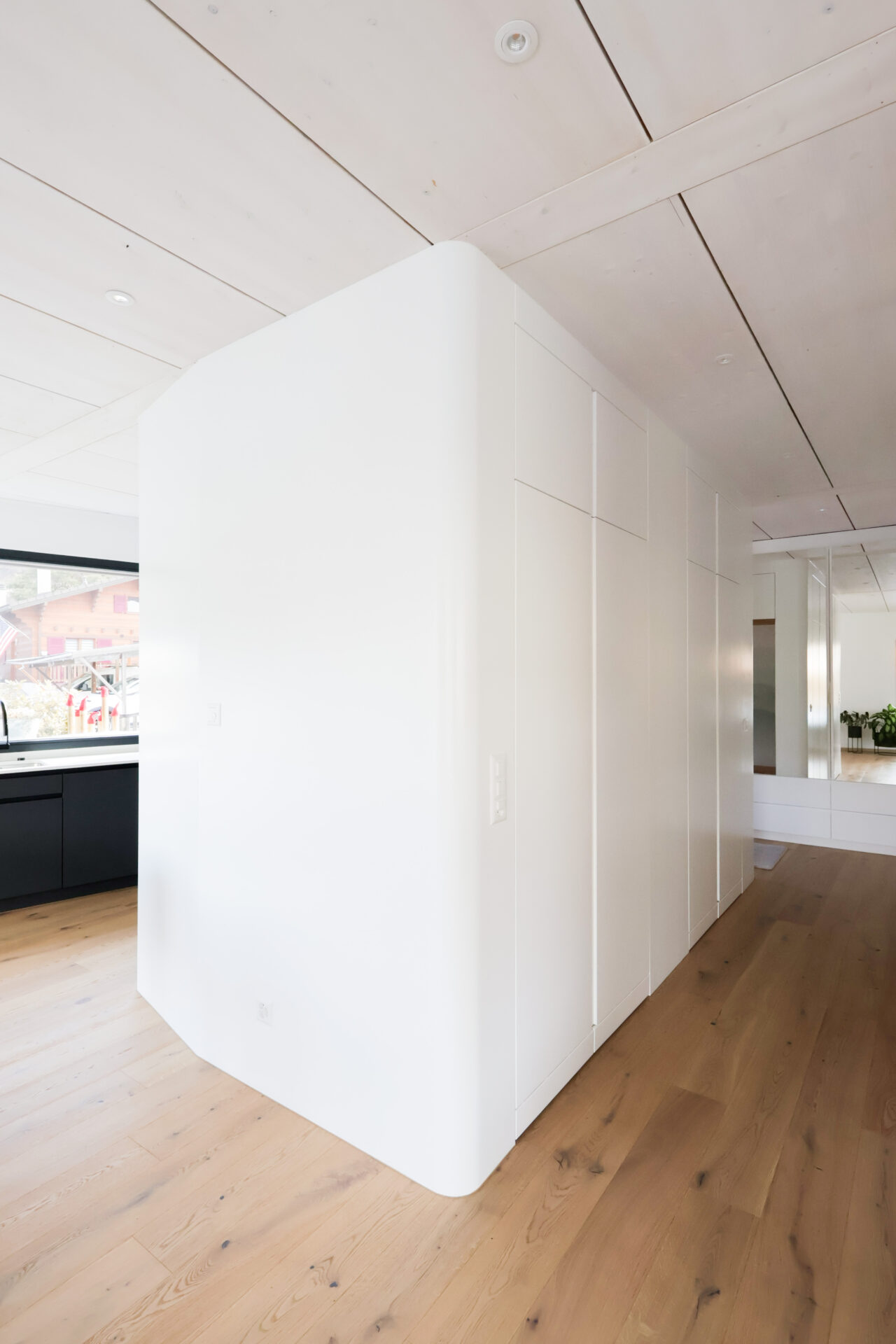 Les boiseries ont été réalisées en émail blanc, avec une armoire en vert pastel à l’étage. Les plafonds ont été finalisés avec des toiles tendues pour une finition moderne et soignée.
